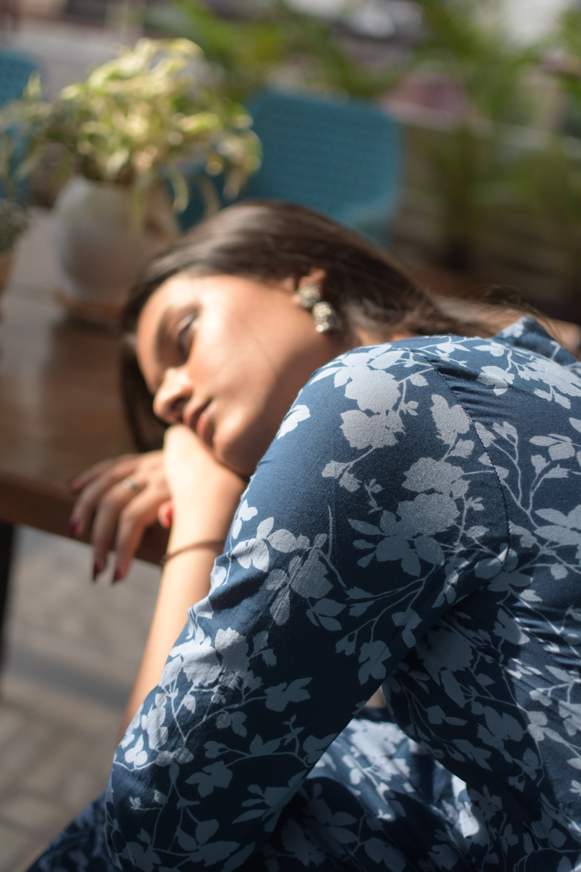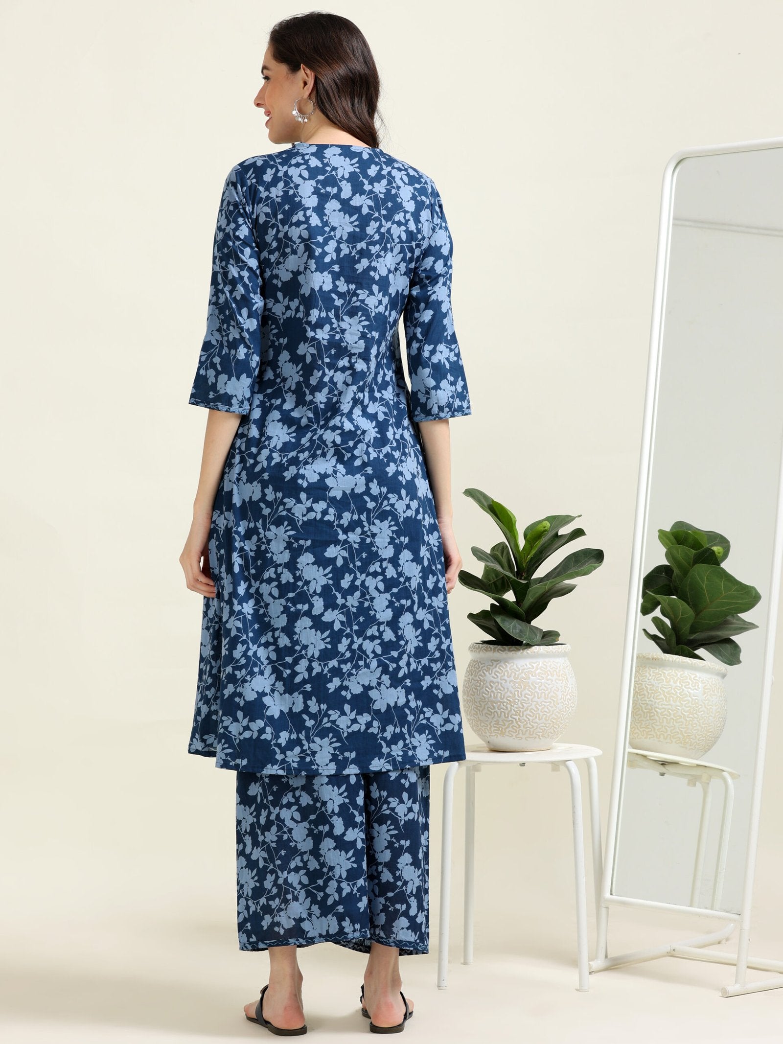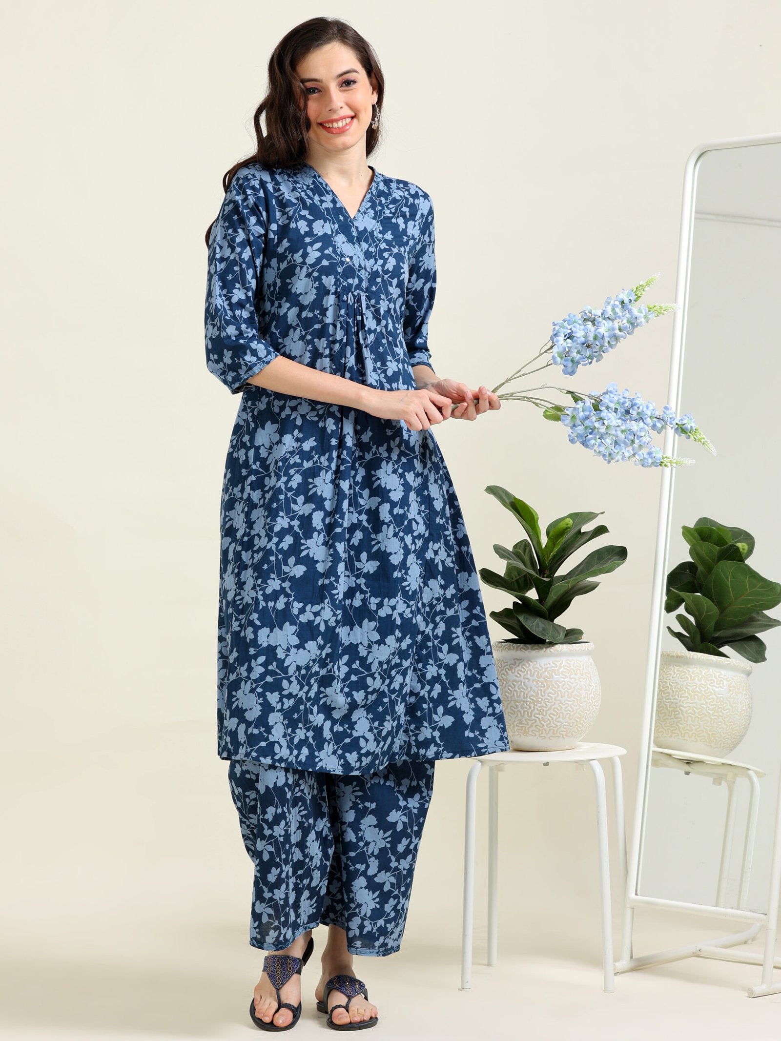 Make a statement with our Navy Cotton Co-ord Set. Featuring a V-neck A-Line Kurti with 3/4th sleeves, scattered mirror work on the neckline, and all-over prints paired with palazzos, this set oozes sophistication. Style with pearl jewelry and a white sling for an elegant finish. Perfect for movie nights or casual outings.