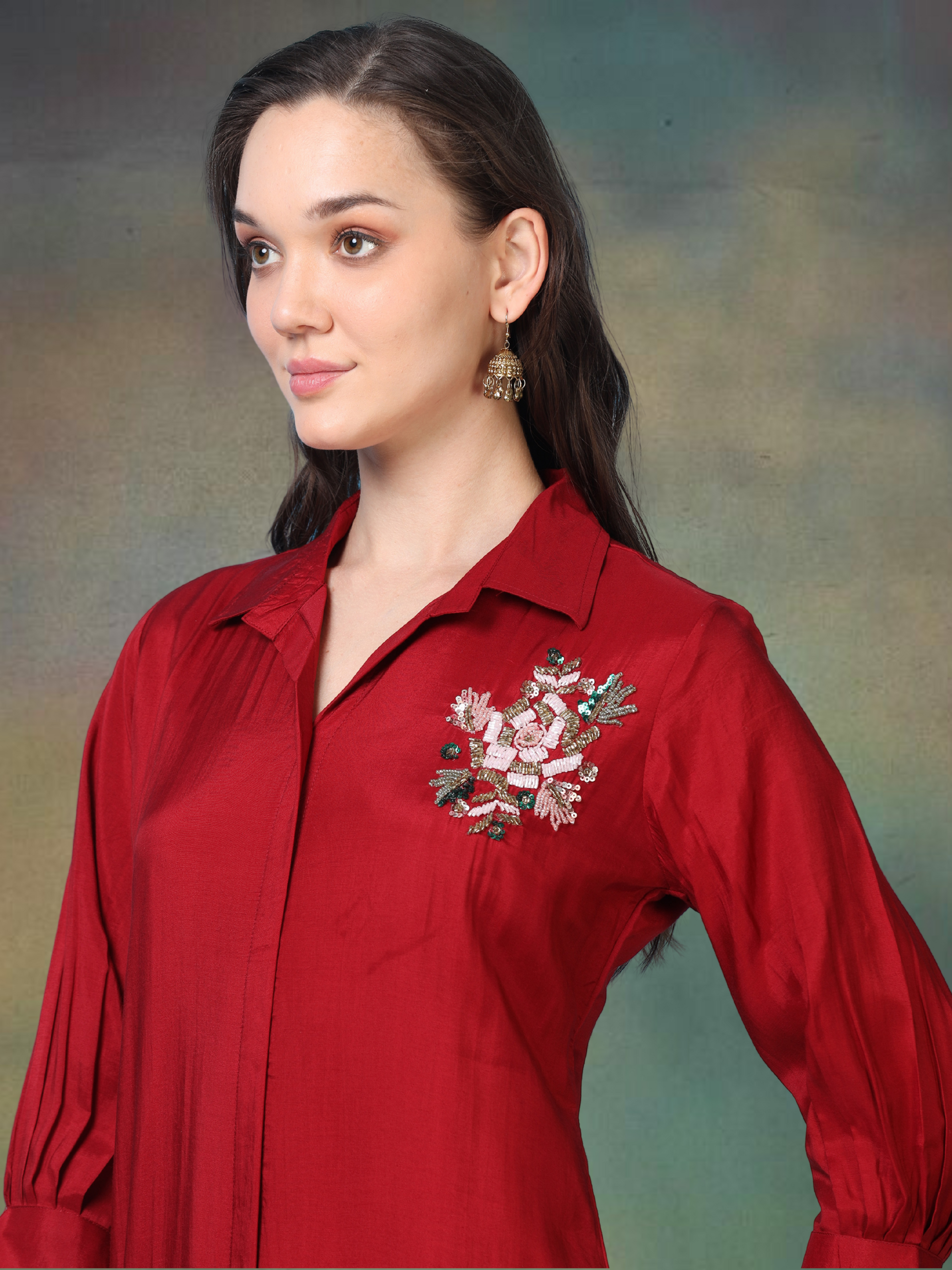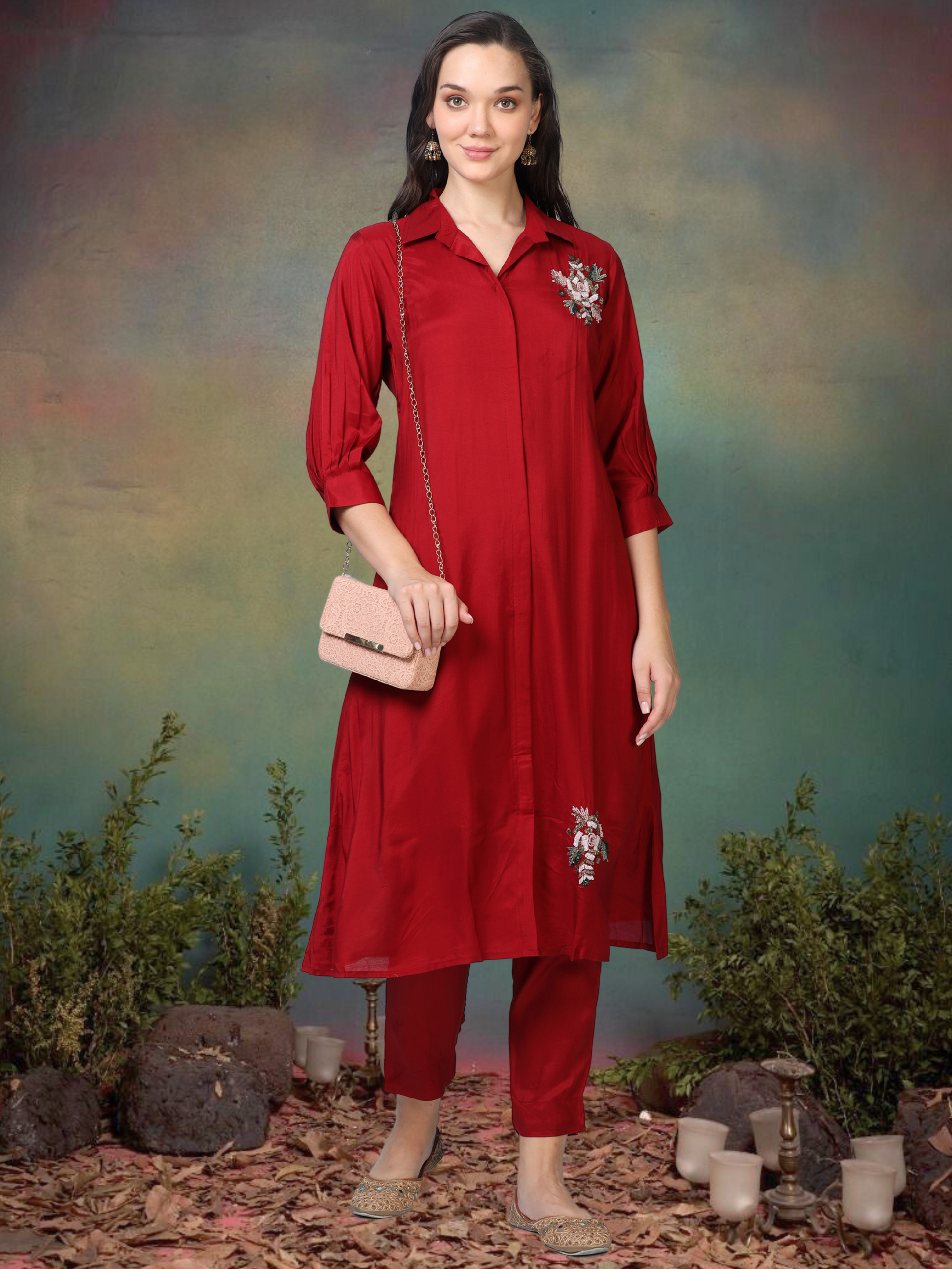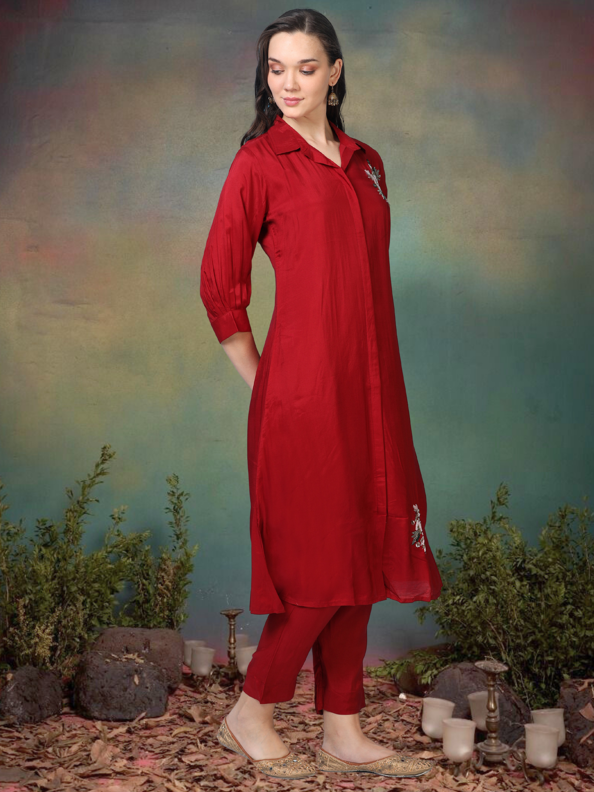 Brunch babe alert! 💃 This satin silk-blend co-ord in a sultry red gives you boss-girl energy with a hint of glam. Featuring a collared shirt-style A-line kurti and matching pants, it's made to slay with pearls, heels, and your coolest sunnies.