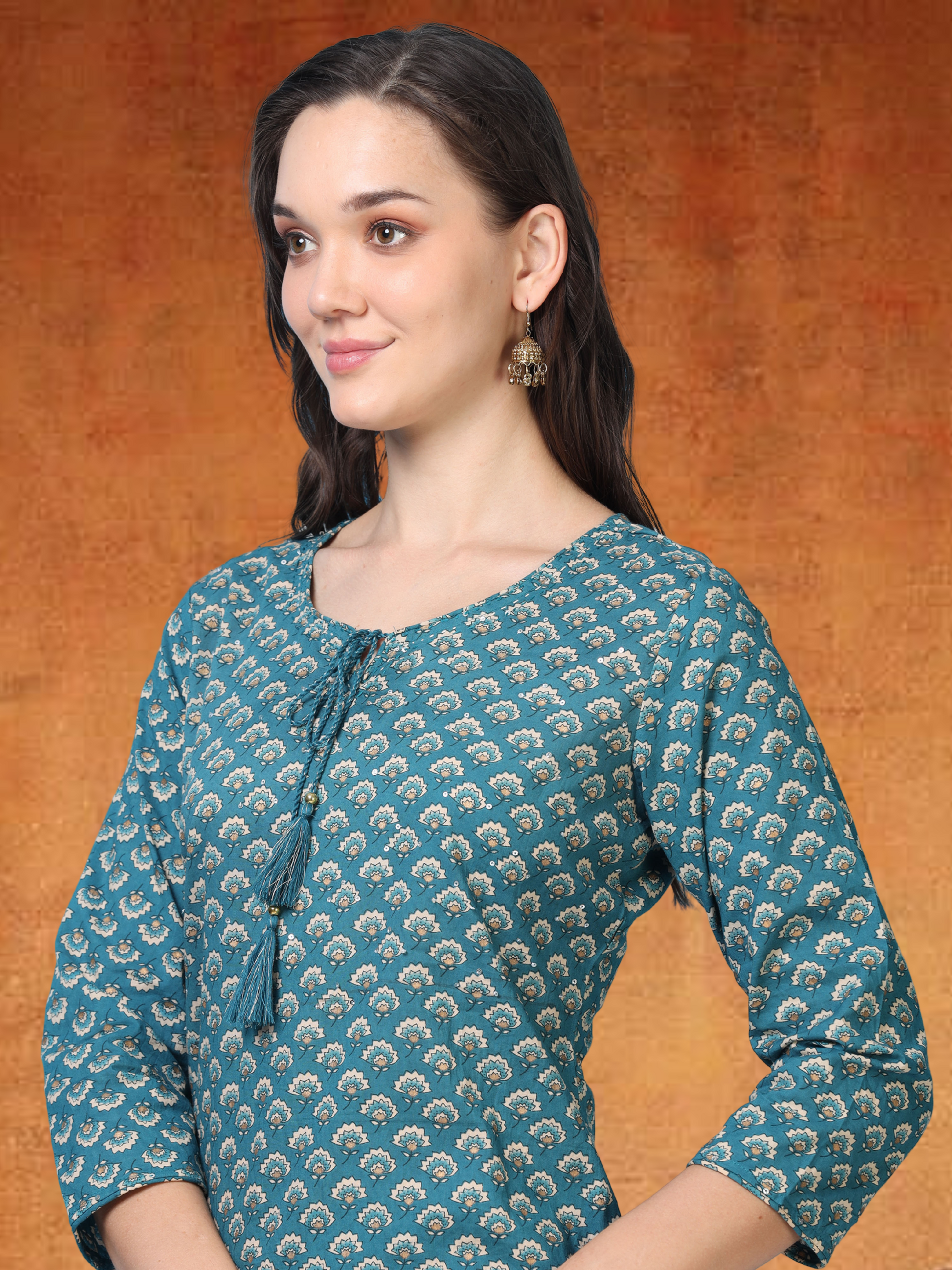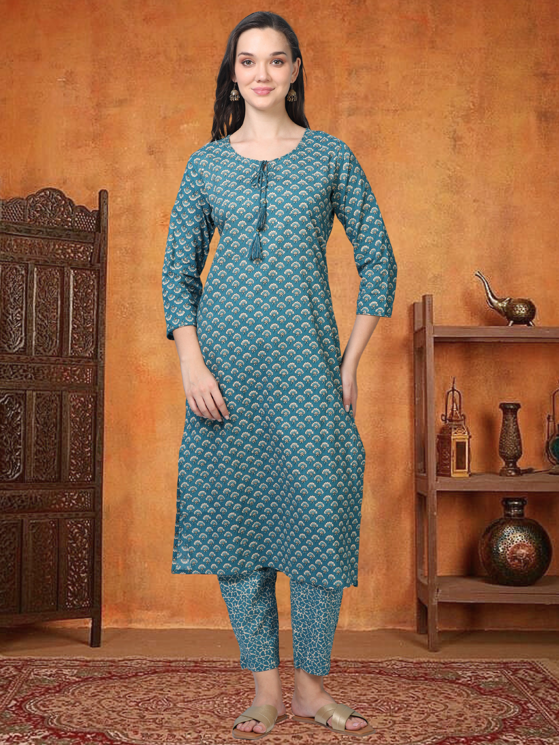 Design Features: Round neck kurti with string detail on the neck with al-over print and printed pants